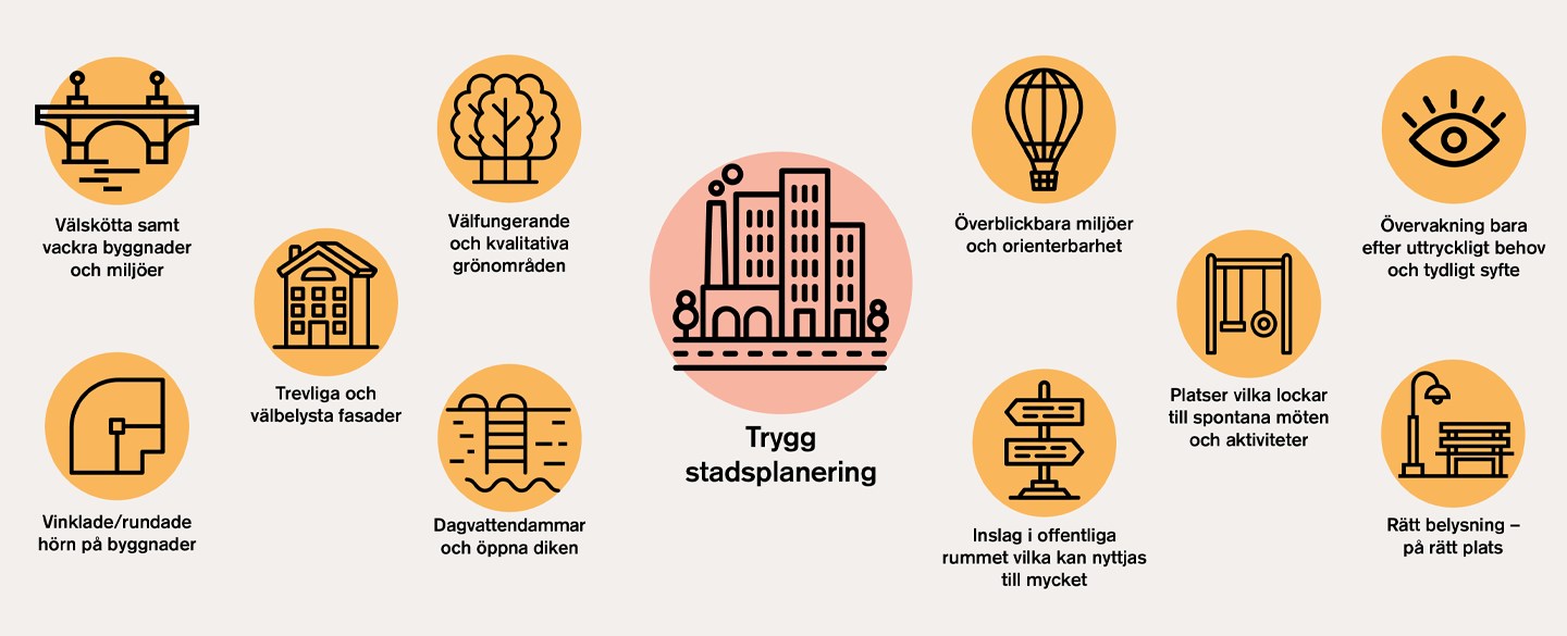 Trygghet som begrepp är svårt att definiera. Hur vi upplever trygghet varierar starkt mellan oss. Därför väljer vi i den här rapporten att fokusera på hur vi utformar det offentliga rummet så att det kan bidra till upplevd trygghet.