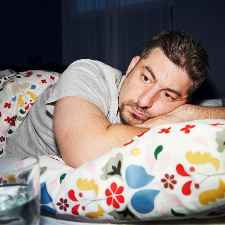 En man ligger i sängen, ser trött ut