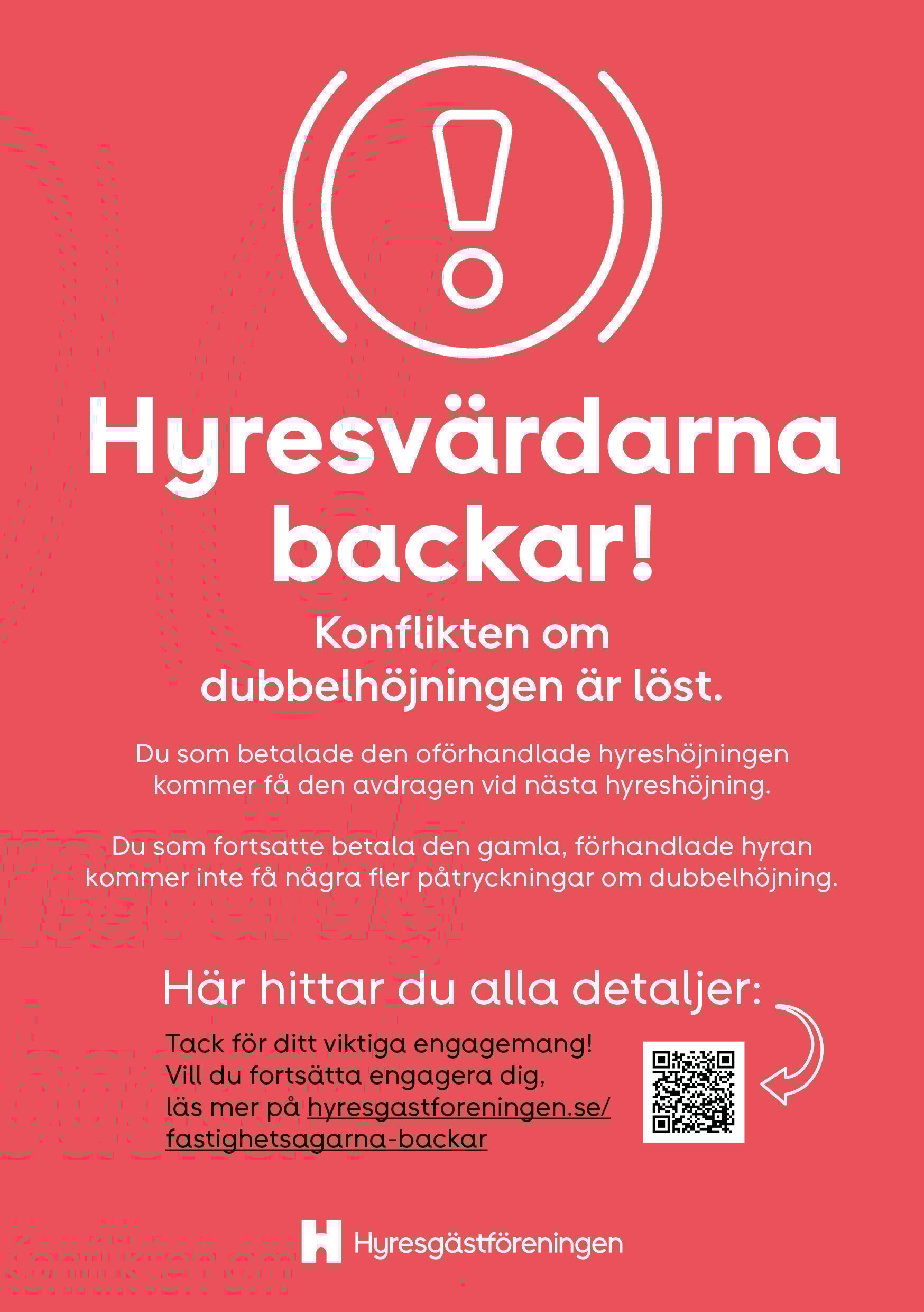 Hyresgästernas protester och samtal mellan Hyresgästföreningen och fastighetsägarna har lett till att Heimstaden, Willhem, Victoriahem och Trianon nu backar från kravet på en extra hyreshöjning under 2023. Den hyreshöjningen kommer inte att ligga till grund för hyrorna som förhandlas 2024 och inga fler påtryckningar ska ske för att få fler hyresgäster att betala den nya, oförhandlade hyran.